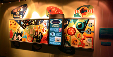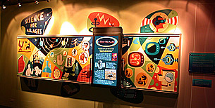 con el dinamismo de los sistemas multimedia interactivos. Sobre el panel impreso, una (o varias) pantallas móviles, amplian la información de la zona sobre la que se sitúan, permitiendo al visitante profundizar en el argumento expositivo mediante recursos multimedia interactivos. |