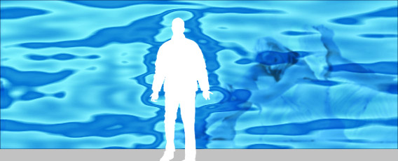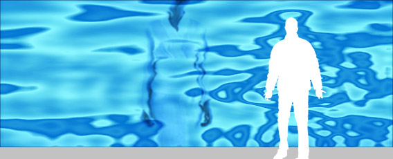 | Cuando se detecta la presencia de visitantes, su silueta provoca turbulencias en la superficie, como un reflejo de su figura que lo hace sentir inmerso dentro de la imagen acuática en continuo cambio. | ||||||