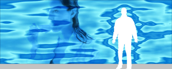 | Simulación gráfica de la instalación mostrando los cuatro elementos visuales que la componenen: Una superficie acuática en continuo movimiento evoca la cultura del agua, la calma, el relax, el frescor, bajo esta superficie, sugerentes imágenes sumergidas de momentos y sensaciones spa y, a veces, textos aparecen desde el fondo provocando pequeñas ondulaciones en la superficie. Por último, la presencia de los espectadores introducen nuevas variaciones en continuo cambio. | ||||||