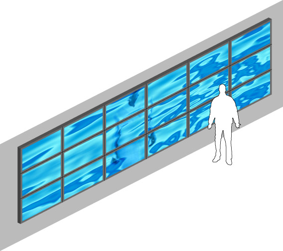 | Instalación basada en monitores de plasma convencional de 42" en configuración videoWall. Aunque sus bordes añaden un aspecto de "ventana" su asequible precio permite construir una gran superficie visible en ambientes de alta luminosodad. | ||||||