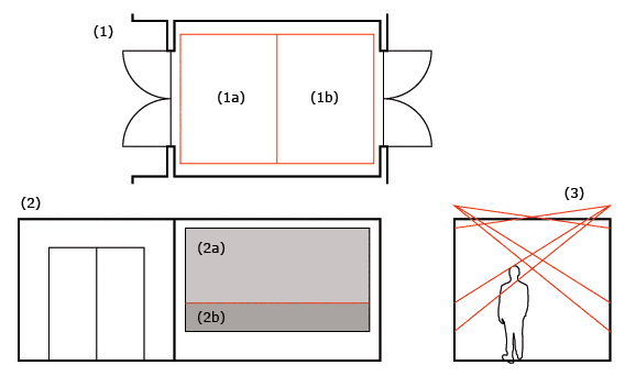 | Esquema de instalación. El espacio es escaneado por dos cámaras de video (1a,1b). Se utilizan dos proyectores (3) de óptica gran angular con el fin de minimizar el espacio de sombra. El diseño del motivo se hace con previsión de la interferencia de este espacio de sombra (2b) | ||||||