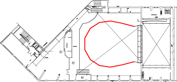 | Punto de vista desde la platea en la planta baja. La barandilla de vidrio permitira ver las pantallas completas. | ||||||