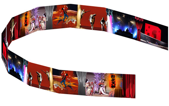 | Esquema de visualización de la instalación, la composición de escenas tendrá en cuenta que las imágenes pueden ser vistas desde los dos lados de la pantalla. | ||||||