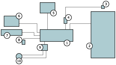 Esquema de conexiones: (1) Ordenador. (2) Monitor 62”-100”. (3) Cámara de video. (4) Capturadora externa USB. (5) Impresora. (6) Monitor de trabajo. (7) Teclado de trabajo. (8) Mouse. (9) Tarjeta de control USB. (10) Pulsador luminoso.