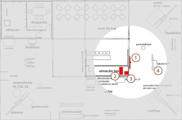 Plano de situación: (1) Pantalla y cámara de video. (2) Equipo informático. (3) Impresora con salida de papel al exterior. (4) Expositor modificado como fondo de imagen.