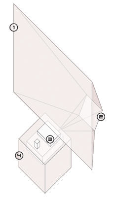 two invisible nylon cables 2 - proyection mirror, allows to hide the projection and computer graphicss hardware 3 - motion detection hardware and video camera 4 - red-orange box, contains hardware and conections |